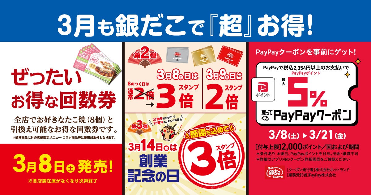 ※3月8日・14日に回数券を購入すると、 「PayPay」 でのお支払いで5%ポイント付与に加え、銀だこスタンプカードのスタンプが3倍付与