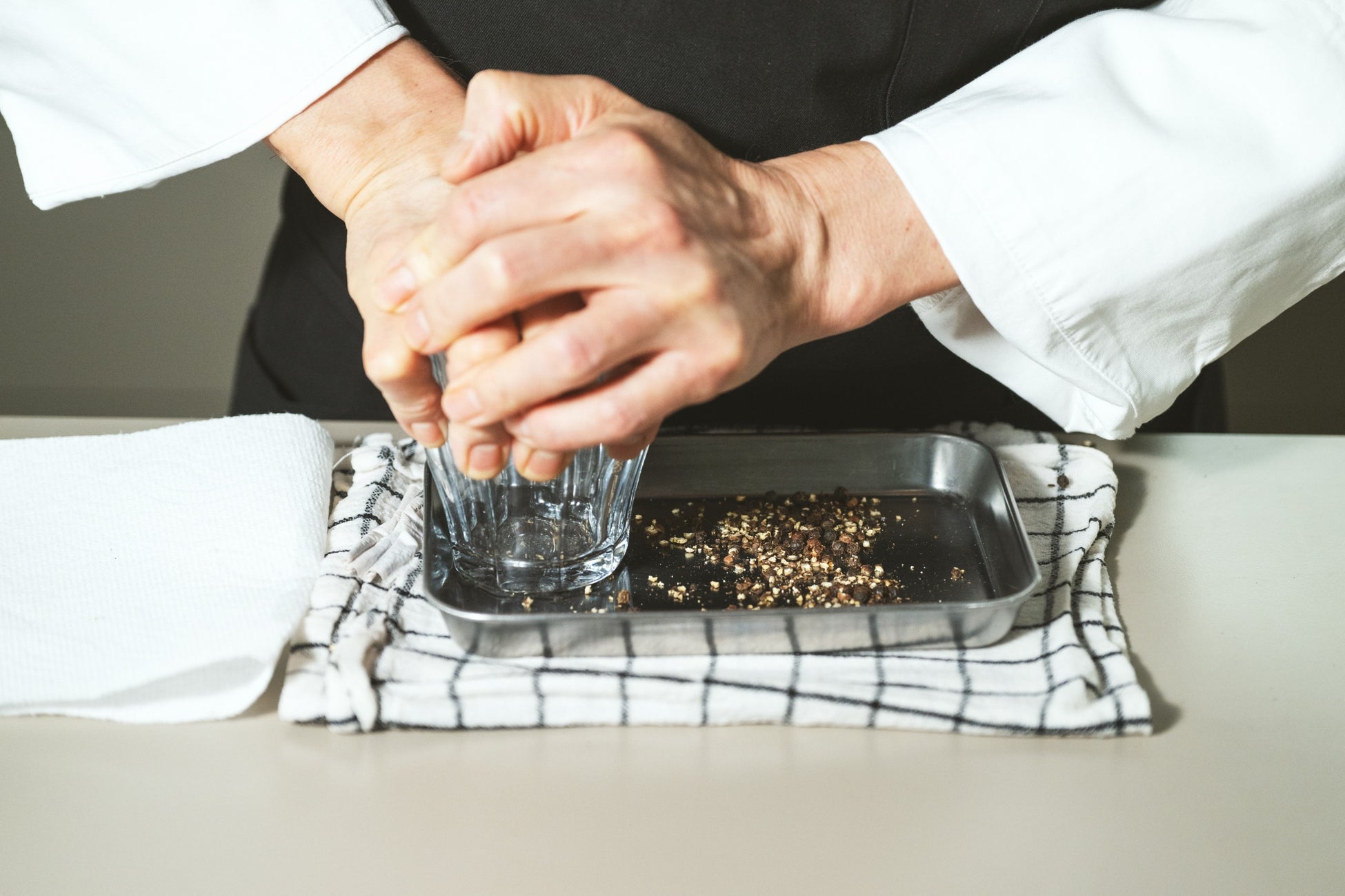 【コップや瓶底でブラックペパーを粗く砕く】