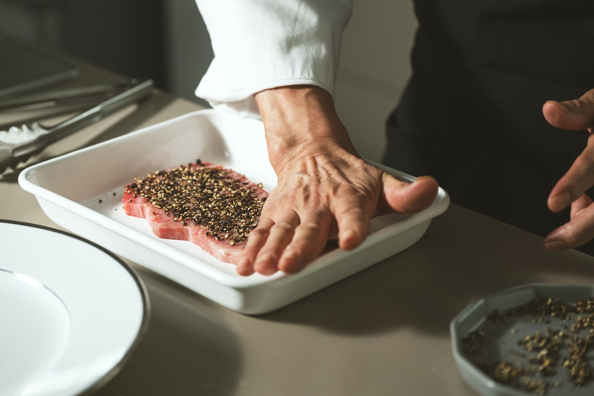 粗挽きのブラックペパーは「貼り付ける」イメージで、しっかりと肉に押し付けて。こうすることでブラックペパーの香りを肉に移すことができる。