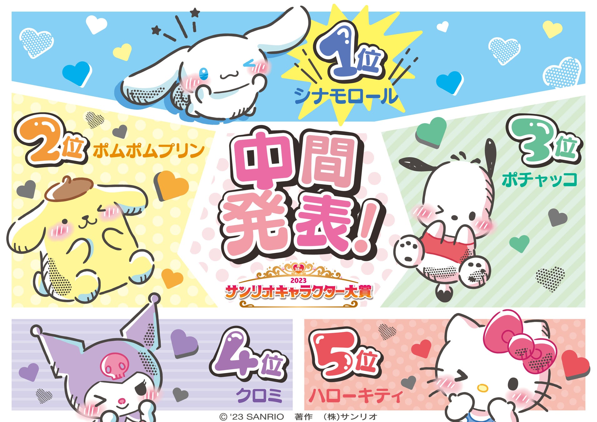 株式会社サンリオ(本社:東京都品川区 代表取締役社長:辻󠄀 朋邦、以下サンリオ)は、4月11日(火)から開催しているサンリオキャラクターの人気投票イベント「2023年サンリオキャラクター大賞」の、中間順位上位20位までを発表いたします。この結果は、投票初日の4月11日(火)11時から5月7日(日)23時59分までのWEB投票と、4月30日(日)までの一部サンリオショップでの投票を集計した順位です(その他いちご新聞での投票などは含みません)。