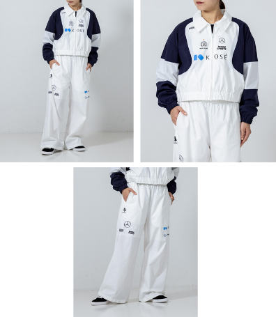 ステージに映えるホワイトカラーをベースに、ネイビーと掛け合わせた都会的で洗練されたイメージでデザインしました。ほつれや破れに強い、ドビーリップストップナイロンポリを採用し、ブレイキン(ブレイクダンス)のアクティブな動きにも対応する機能性も兼ね備えています。ダンスの動きがより際立つよう、袖のカラー配分や、パンツの太さなどの細部にもこだわり、ブレイキンのダイナミックなイメージの中にも、品をプラスするようなセットアップで、新たな表情を演出します。
