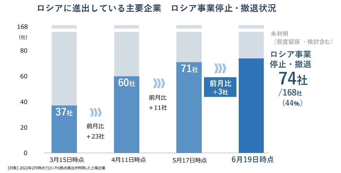 ロシアでのビジネスから撤退=日本企業の「脱ロシア」の動きが止まった。2022年2月時点でロシアへの進出が判明した国内上場企業168社のうち、6月19日までにロシア事業の停止や制限・撤退を発表・公開した企業は前月から3社増え、全体の4割に当たる74社が判明した。4月時点でゼロだったロシアからの完全撤退を表明した企業は、新たに1社判明した。一方、受注残といった理由や、ロシア国内での新規事業の投資負担から現地事業を当面継続する企業も判明した。