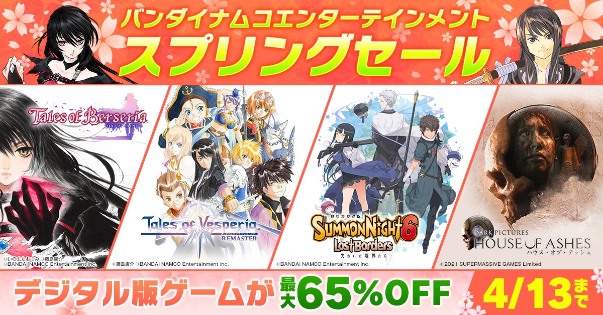 セール期間中、「テイルズ オブ ベルセリア Welcome Price!!」が60%OFFの1,672円(税込)、「テイルズ オブ ヴェスペリア REMASTER」が53%OFFの2,946円(税込)、「サモンナイト6 失われた境界たち Welcome Price!!」が53%OFFの1,964円(税込)、「THE DARK PICTURES: HOUSE OF ASHES(ハウス・オブ・アッシュ)」が30%OFFの2,464円(税込)になるなど、バンダイナムコエンターテインメントのダウンロード版ゲームがお得な価格でお買い求めいただけます。このチャンスをお見逃しなく!