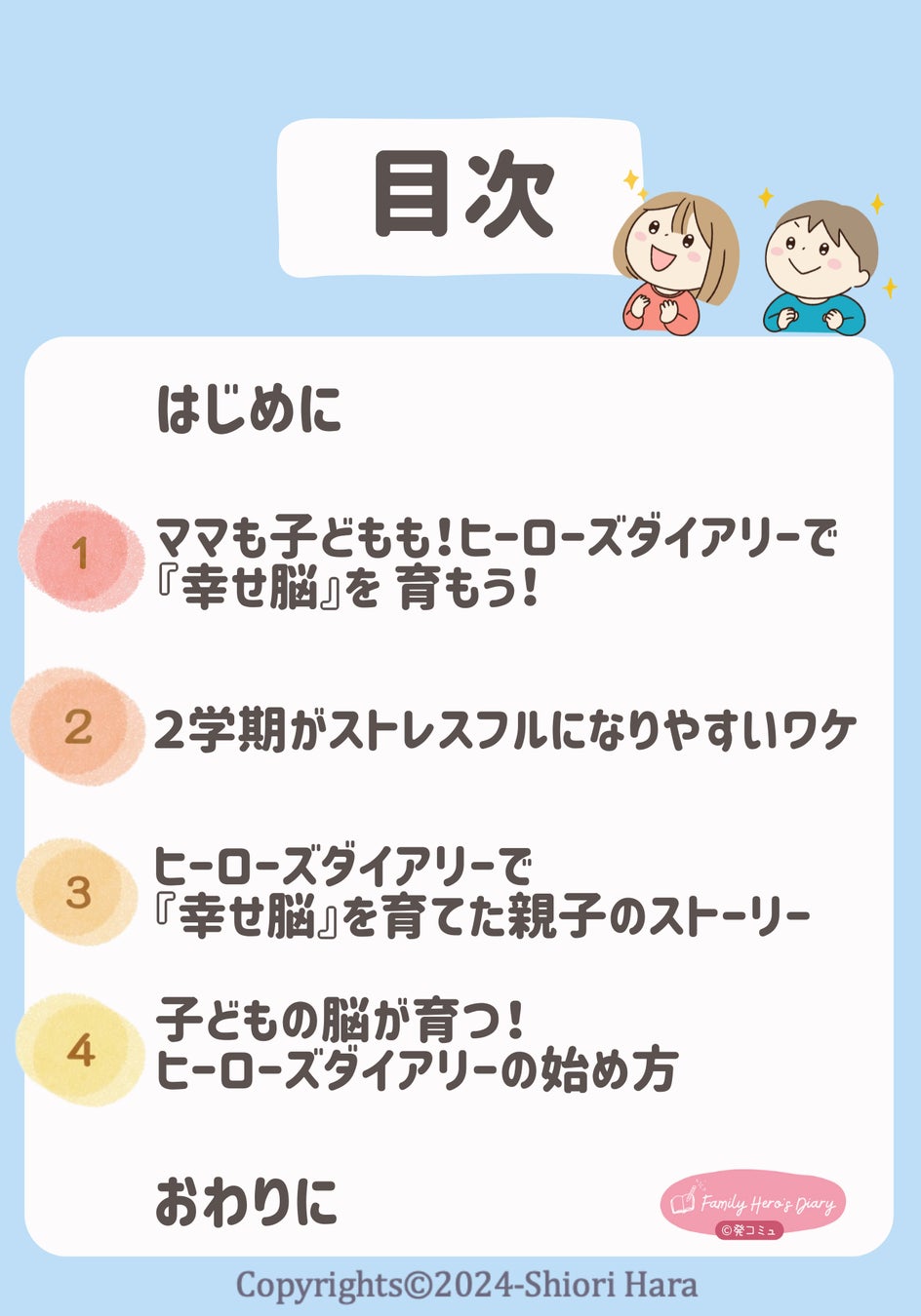 初めまして、親子のコミュニケーションをスムーズにして子どもの発達を加速させる「発達科学コミュニケーション」トレーナーのはらしおりと申します。この度、『\集団生活でストレスをためて荒れる子専用!/【楽しく頑張る力】を伸ばす!親子のヒーローズダイアリー』電子書籍無料ダウンロードを開始しました。