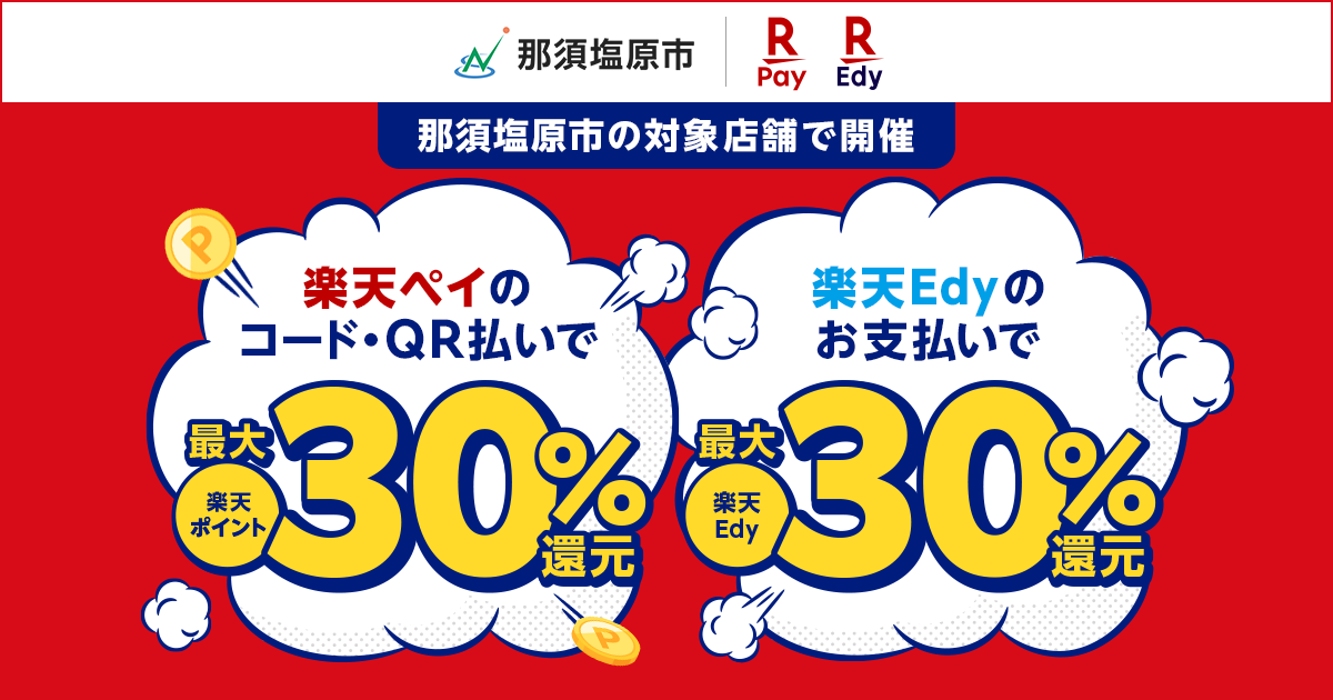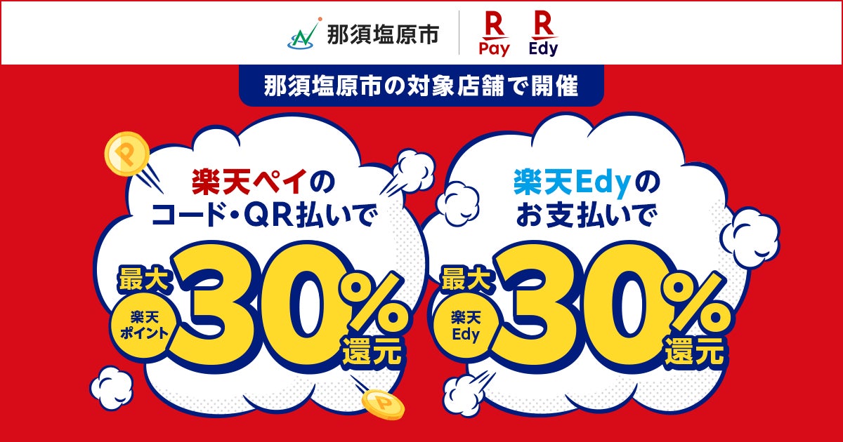 「楽天ペイ」「楽天Edy」、栃木県那須塩原市が実施する「もっとなすしおばらLife!キャッシュレス決済で30%還元キャンペーン」に参加