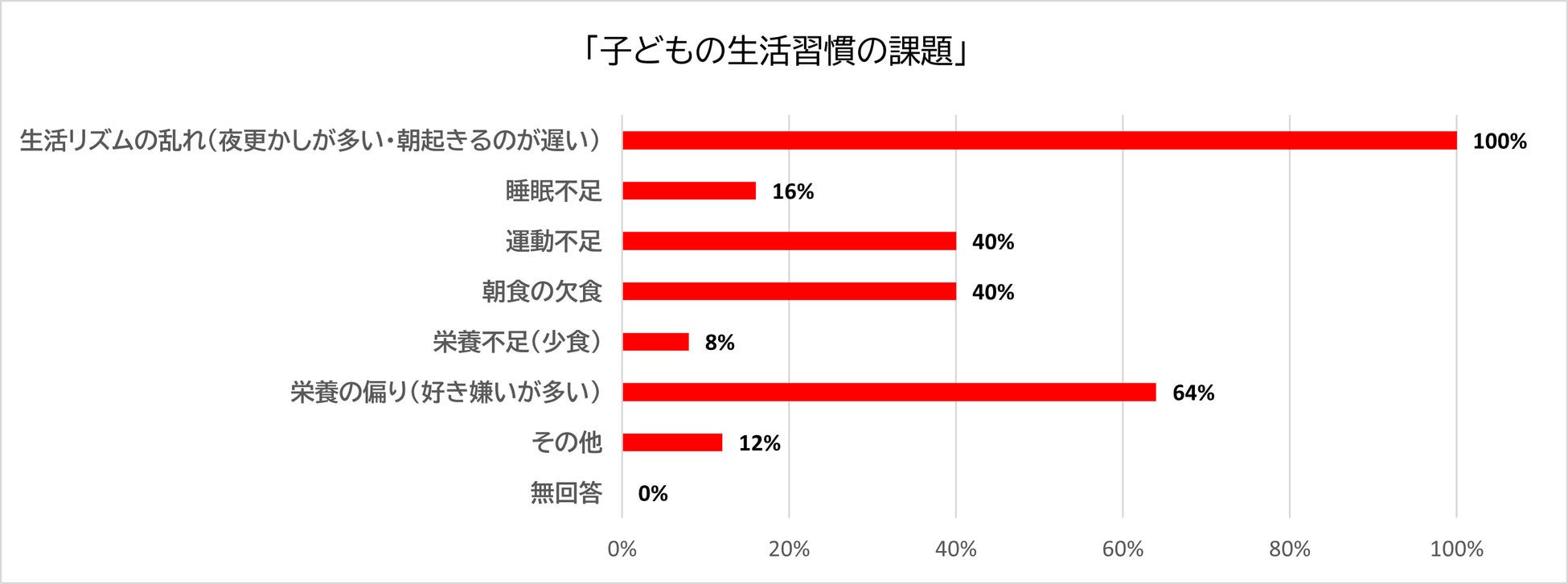 アンケートの結果、園は「生活リズムの乱れ」「食事」「運動不足」を生活習慣の課題と感じている