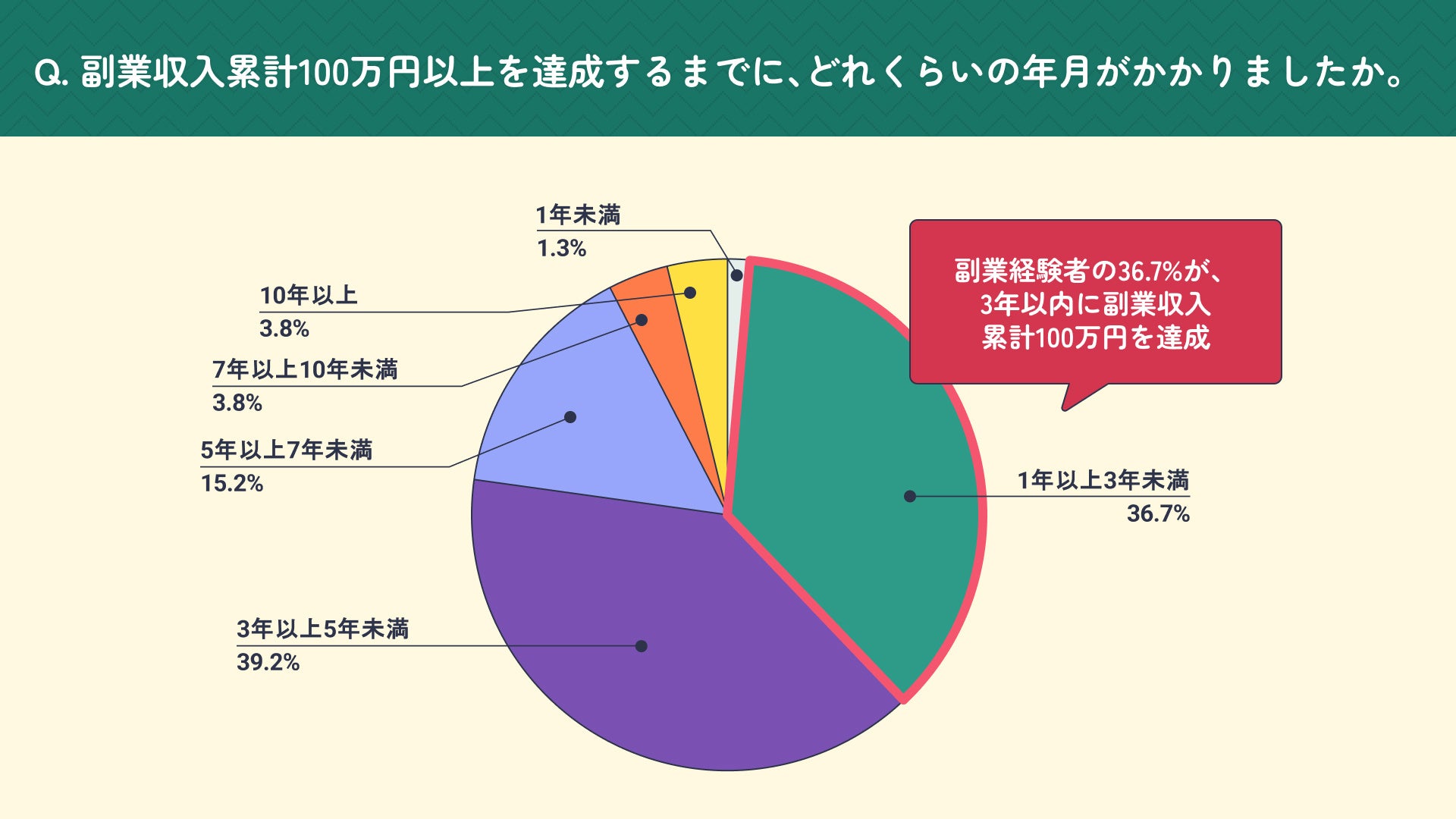 また、副業で得た収入累計金額100万円以上を達成するまでの期間について尋ねたところ、「3年以上5年未満」が最多の39.2%となり、次いで「1年以上3年未満」が36.7%という結果になりました。