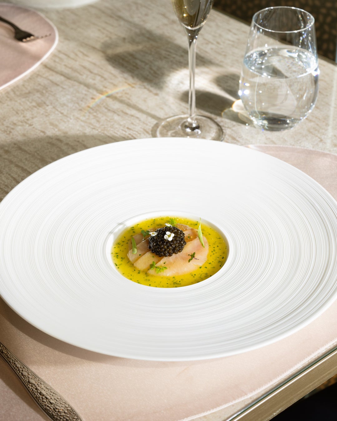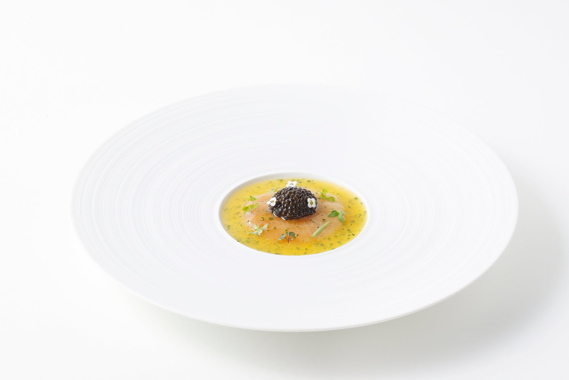 桜チップでスモークしたハマチのカルパッチョに、酸味のあるビネグレットソースを合わせた一皿。刻んだシブレットとパセリが、香りと彩りを華やかに引き立てます。トップのクリスタルキャビアの程よい塩味がアクセント。