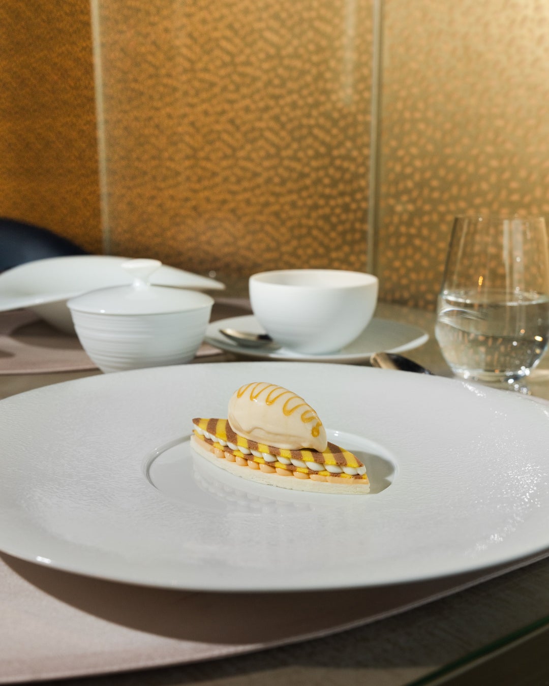濃厚な蜂蜜の甘味が口いっぱいに広がる、メインのデザート。蜂蜜のジェラートの下には、蜂蜜のチュイールでサンドしたフロマージュブランのクリーム、蜂蜜のムースとキャラメルのクリームが層になった、可愛らしいルックスの一皿です。