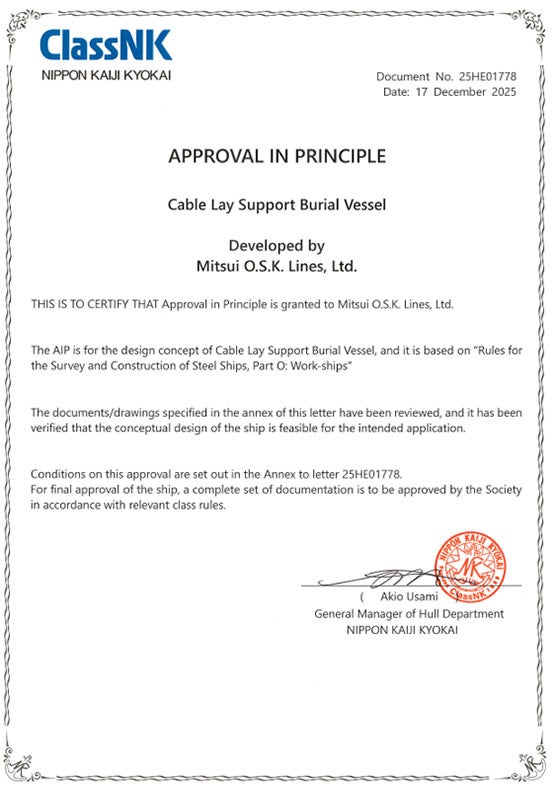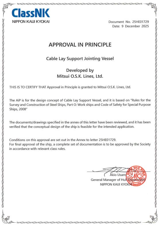 株式会社商船三井(社長:橋本 剛、本社:東京都港区、以下「当社」)は海底送電ケーブルの接続船および埋設船(註1)について、一般財団法人日本海事協会(会長:菅 勇人、本部:東京都千代田区、以下「ClassNK」)から基本設計承認(Approval in Principle : AiP)(註2)を取得しました。