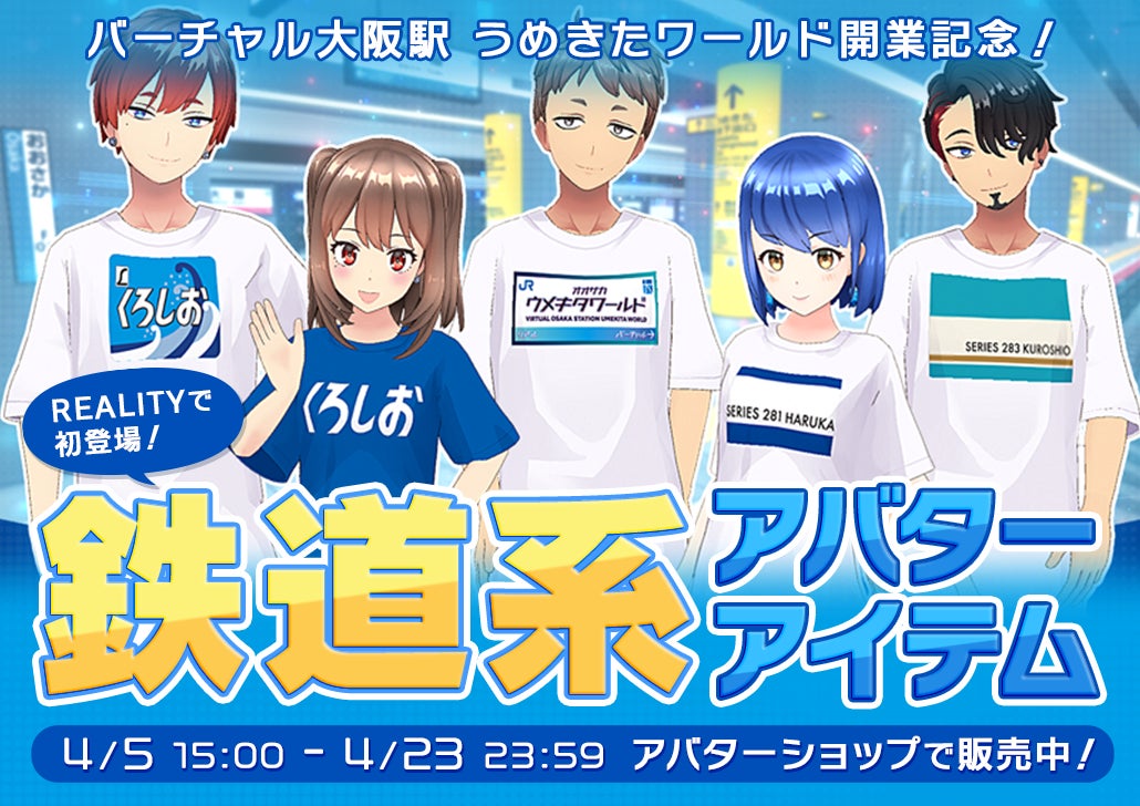 「バーチャル大阪駅 うめきたワールド」開業を記念し、大阪駅(うめきたエリア)に実際に発着する「関空特急はるか」や「特急くろしお」の特急列車名やトレインマークをあしらったオリジナルデザインのアバターTシャツアイテムを期間限定で販売します。