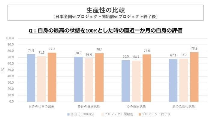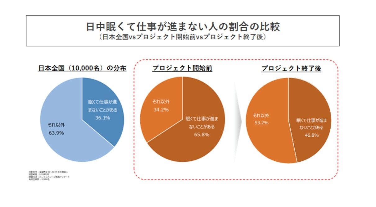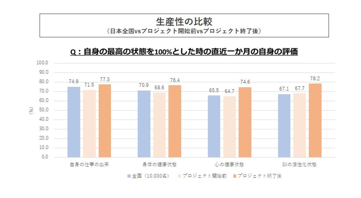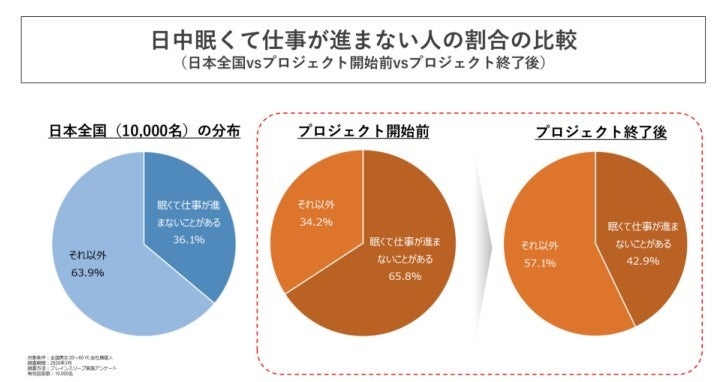 オフィスワーカーにとって重要な指標の一つである生産性に関する数値の向上も見られました。身体と心の健康状態や脳の活性状態においてはそれぞれ+10ポイントが確認できました。また生産性において重要な指標である日中の眠気に関しては「日中眠くて仕事が進まないことがある」との回答が-22.9ポイントという結果でした。