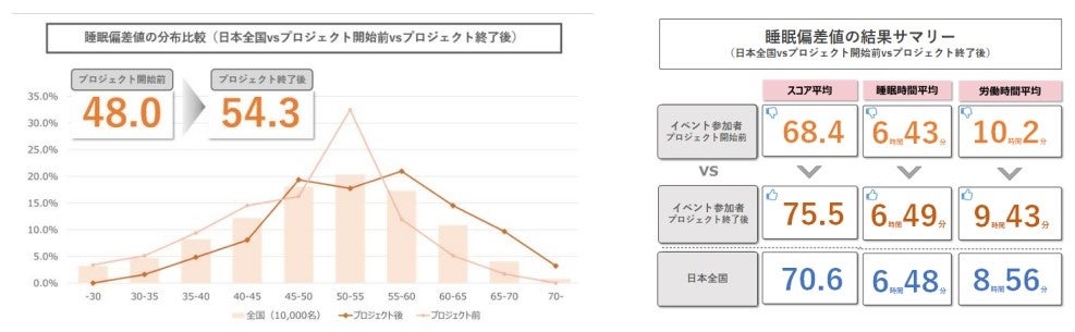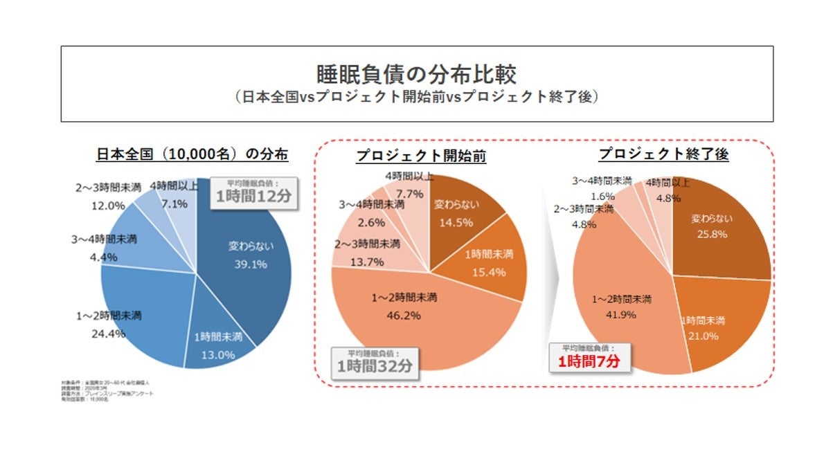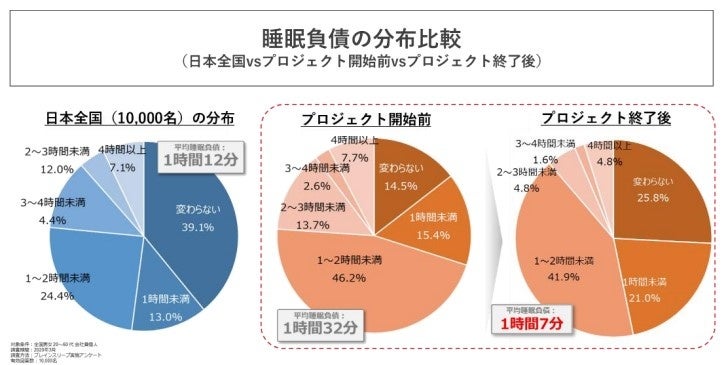 睡眠偏差値はプロジェクト開始前の48.0と比べて、+6.3ポイントとなる54.3と大幅に改善しました。また睡眠時間においても、+6分改善されました。睡眠負債※4においては25分の改善が見られました。これは睡眠改善の知識を学び、コンテンツなどを活かして睡眠習慣を見直し、正しく習慣化することで、睡眠の質が改善された結果であると考えられます。