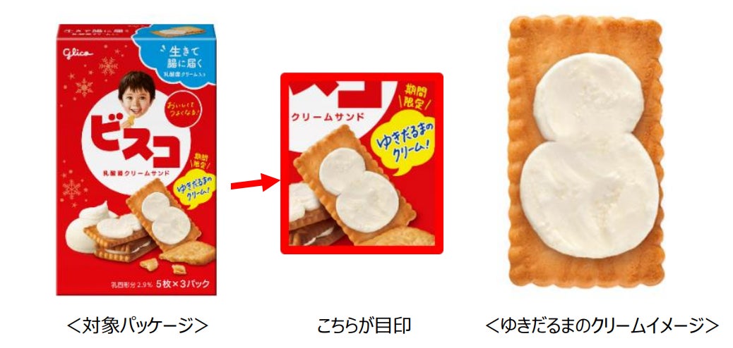 ※1 取り扱い店舗の在庫状況に応じて順次、ゆきだるまのクリームの「ビスコ」へ切り替わります。在庫がなくなり次第終了とさせていただきます。パッケージに「ゆきだるまのクリーム!」と記載のある商品が対象となりますので、パッケージをご確認ください。