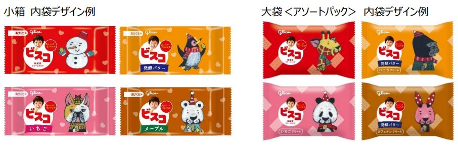 ゆきだるまのクリーム対象の小箱商品と、ウインターデザインの対象マークが付いた大袋<アソートパック>の内袋は、2022年からビスコブランドとさまざまな取り組みを行っている絵本作家の谷口智則さんが描きおろしたオリジナルデザインです。ゆきだるまや動物たちが描かれたデザインで、小箱24種類と大袋<アソートパック>12種類の全36種類あり、パッケージを開けた後もお楽しみいただけます。