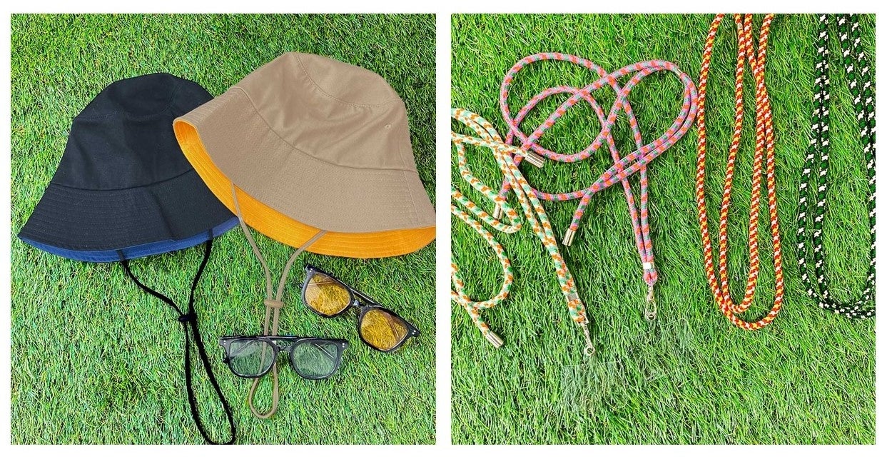 Tシャツやサファリハット、サングラスはキャンプでもタウンユースでも便利なデザインで登場します。バケットハットは裏地のカラーがポイントで、調節可能な紐付きです。両手が空いて動きやすいスマホショルダーは、アウトドアシーンでは特に便利なアイテムです。