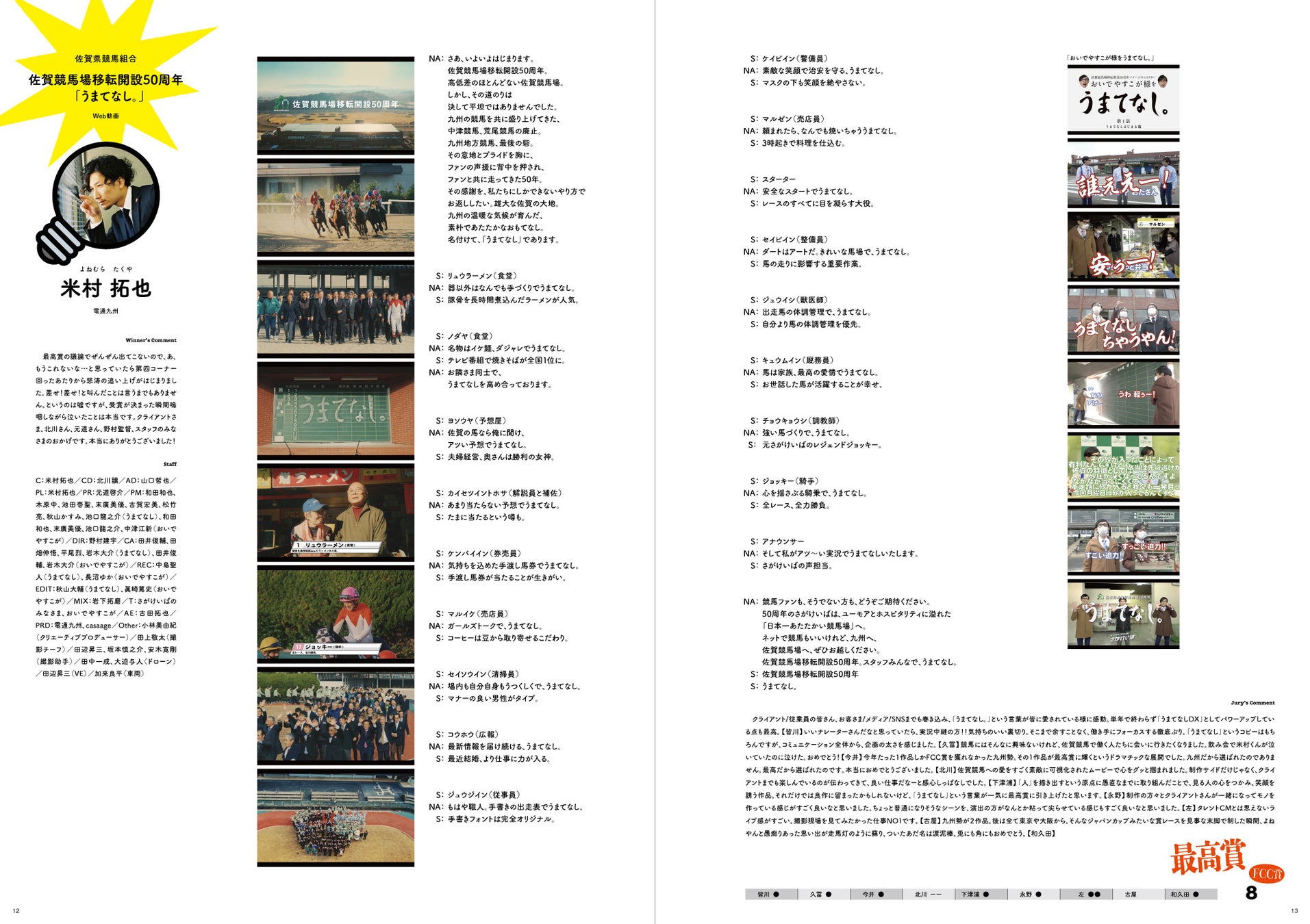 2022年度のFCC賞は、ムービー166点、グラフィック140点、ラジオCM34点、デジタル29点、混合39点で計408点の応募があり、昨年から50点近く増えました。最高賞はこの中から、米村拓也さん(電通九州)の佐賀県競馬組合のWebムービー「佐賀競馬場移転開設50周年『うまてなし。』」が選ばれました。