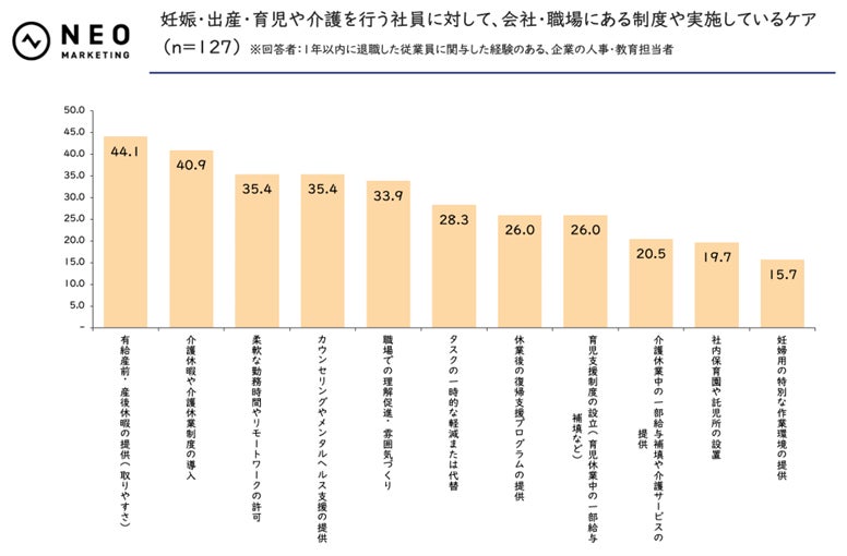 また、人事担当者には妊娠・出産・育児や介護をおこなう社員に対し、会社・職場にある制度、実施されているケアをお聞きしました。なお、以下のグラフは上位11項目を表示しています。