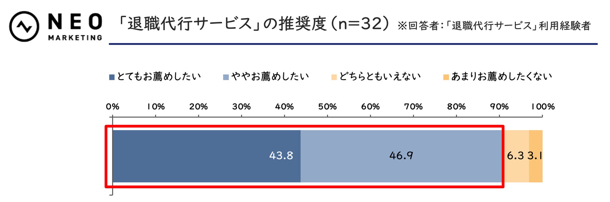 前掲した設問【「退職代行サービス」をどの程度知っているか】にて「退職代行サービス」を「利用したことがある」と回答した人に対し、サービスの推奨度をお聞きしました。