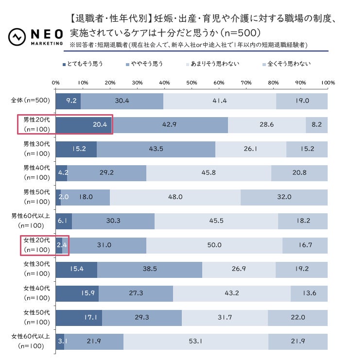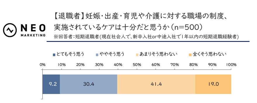 短期退職者と人事担当者それぞれに対し、妊娠・出産・育児や介護に対して職場で用意されている制度、実施されているケアは十分だと思うかお聞きしました。