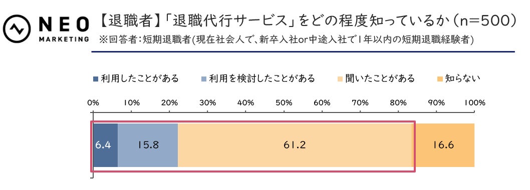 短期退職者と人事担当者それぞれに対し、「退職代行サービス」をどの程度知っているかお聞きしました。(※退職代行サービス:従業員本人に代わって、勤務先に退職意思を伝え、退職完了までに必要な手続きなどをおこなうサービス)