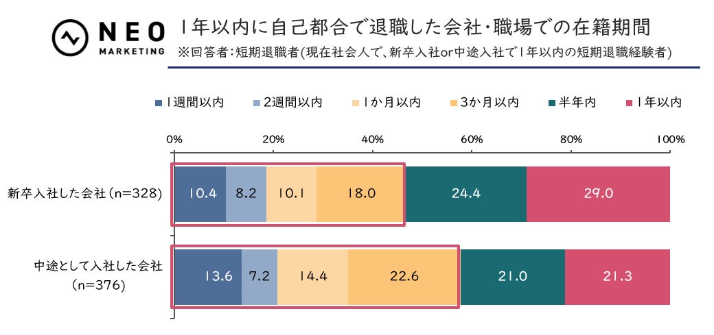 また、在籍期間が長くとも3か月以内(「1週間以内」「2週間以内」「1か月以内」「3か月以内」の合算)の割合で比較しても、新卒入社した会社の場合は46.6%、中途として入社した会社の場合は57.7%と、後者の方が11.1ポイント高くなっていました。