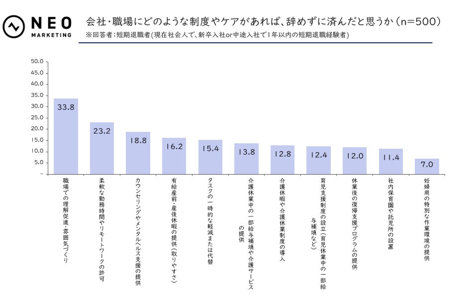 短期退職者に、会社・職場にどのような制度やケアがあれば辞めずに済んだと思うかお聞きしました。