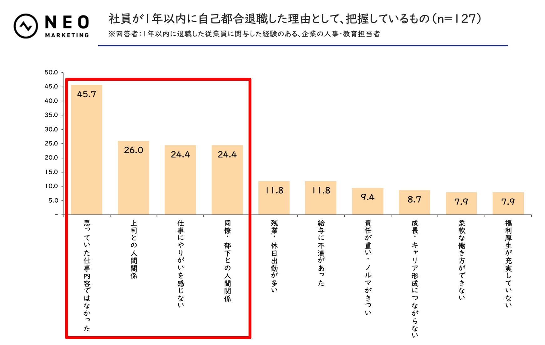 入社後の教育カリキュラムや交流会など、会社側で準備している「ケア」の数は多いものの、それが社員側の不安や不満を取り除くものになっていない可能性が考えられます。