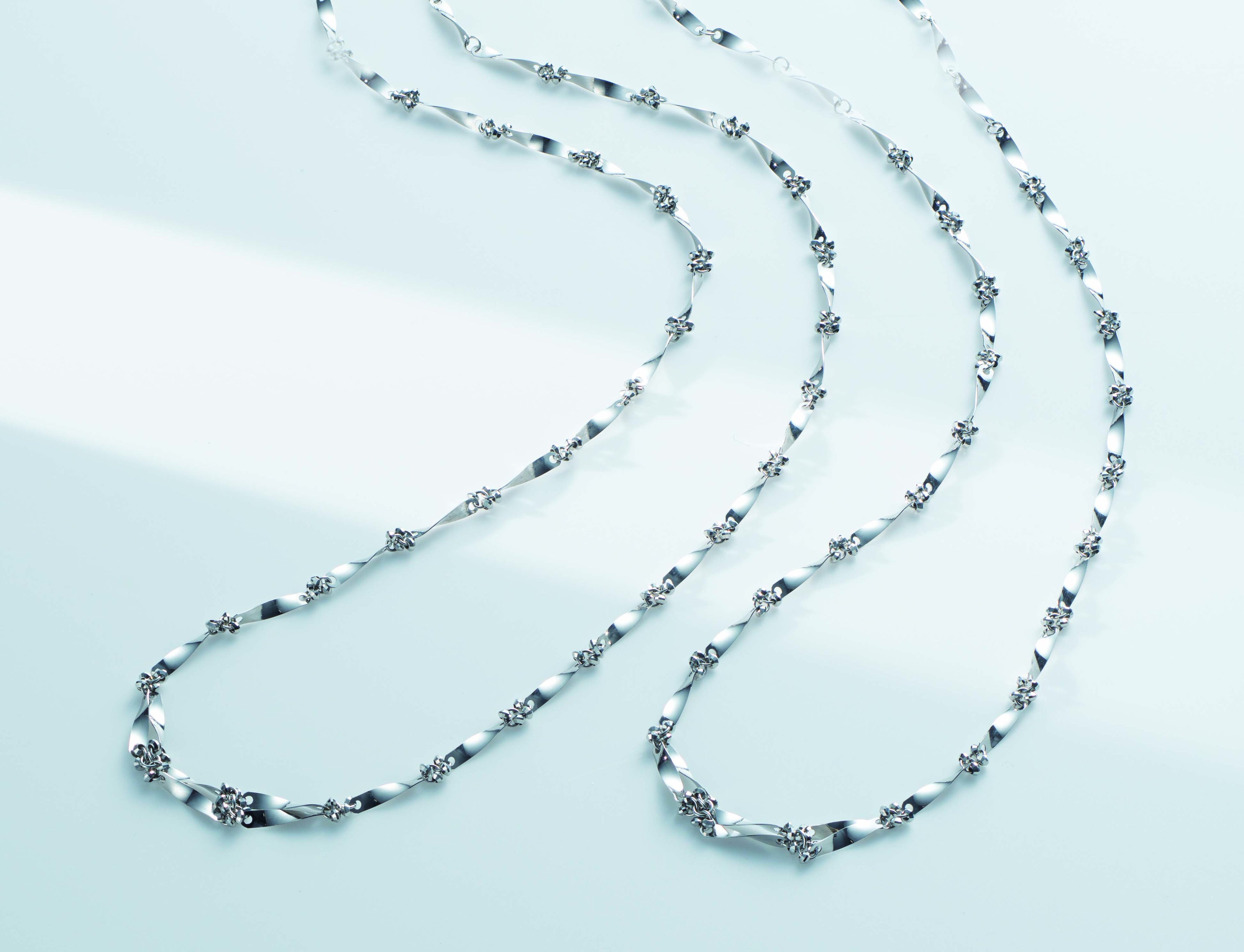 純プラチナを高度な技術で加工し、鏡面仕上げを施したネックレスを、長さ違いで紹介します。