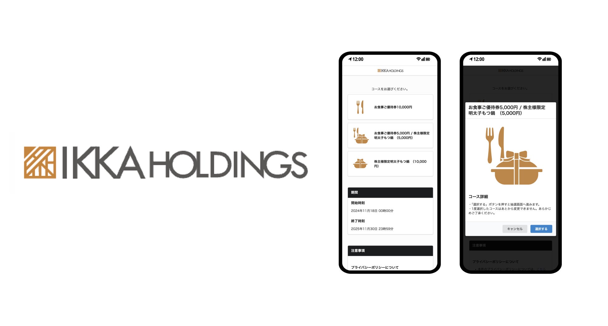 株式会社一家ホールディングスの株主優待は、従来、グループが運営する飲食店にて飲食代金としてご利用いただける紙の「株主優待券」でしたが、優待内容の拡充にあわせて株主優待の電子化を決定されたことを受け、「ネットで優待」を導入いただきました。電子化は、第三者による不正利用の防止や破損や紛失のリスク低減、株主の皆様の利便性向上のほか、ペーパーレス化の推進など環境への配慮を目的とした取り組みです。2024年11月下旬から順次送付する「優待のご案内」に印刷された二次元コードを読み取ることで、「屋台屋 博多劇場」「こだわりもん一家」「TANGO」「大衆ジンギスカン酒場ラムちゃん」「にのや」「韓国屋台ハンサム」の全店でご飲食代金として1円単位でご利用いただける電子チケットを受け取ることが可能です。なお、保有株数に応じて5,000 円相当の「明太もつ鍋セット」の配送型ギフトと引換えることも可能です。電子チケットのご利用金額は、スマートフォン上で手軽にご確認いただけます。スマートフォンをお持ちでない株主様も「優待のご案内」を該当店舗にご持参いただくと、店頭に設置している iPad などから店舗スタッフが代理処理を行うことでき、優待の店頭での利用が可能となります。
