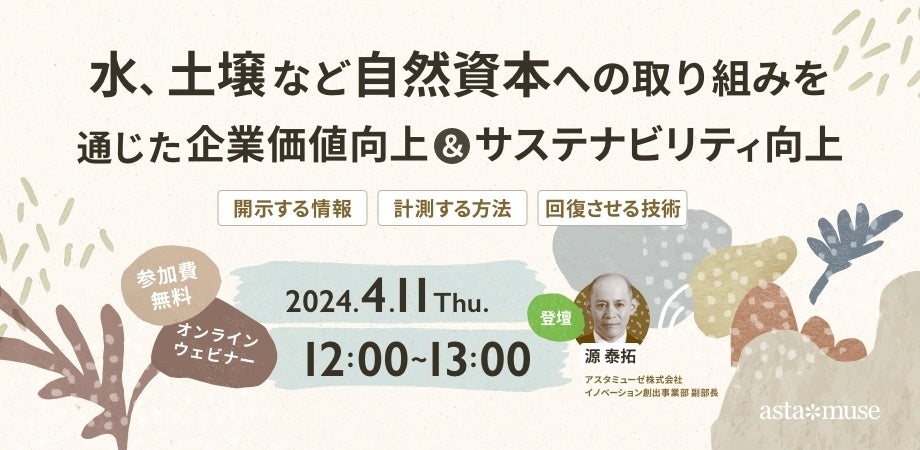 企業のサステナビリティ関係者向け無料ウェビナー「水、土壌など自然資本への取り組みを通じた企業価値向上&サステナビリティ向上 ~開示する情報・計測する方法・回復させる技術~」を再開催