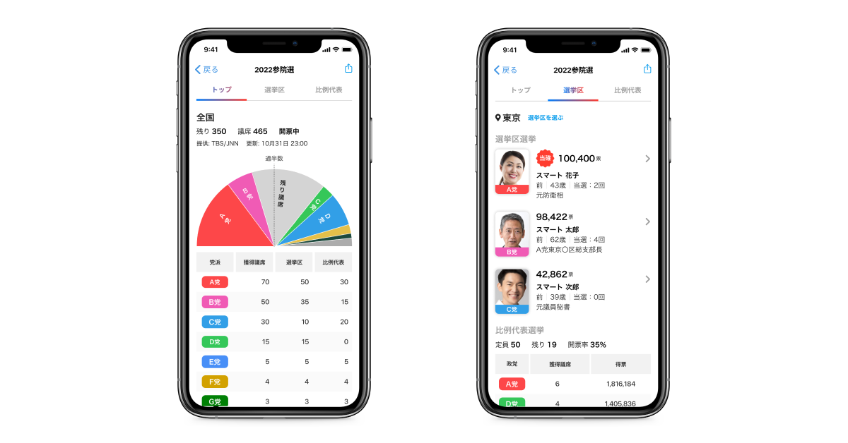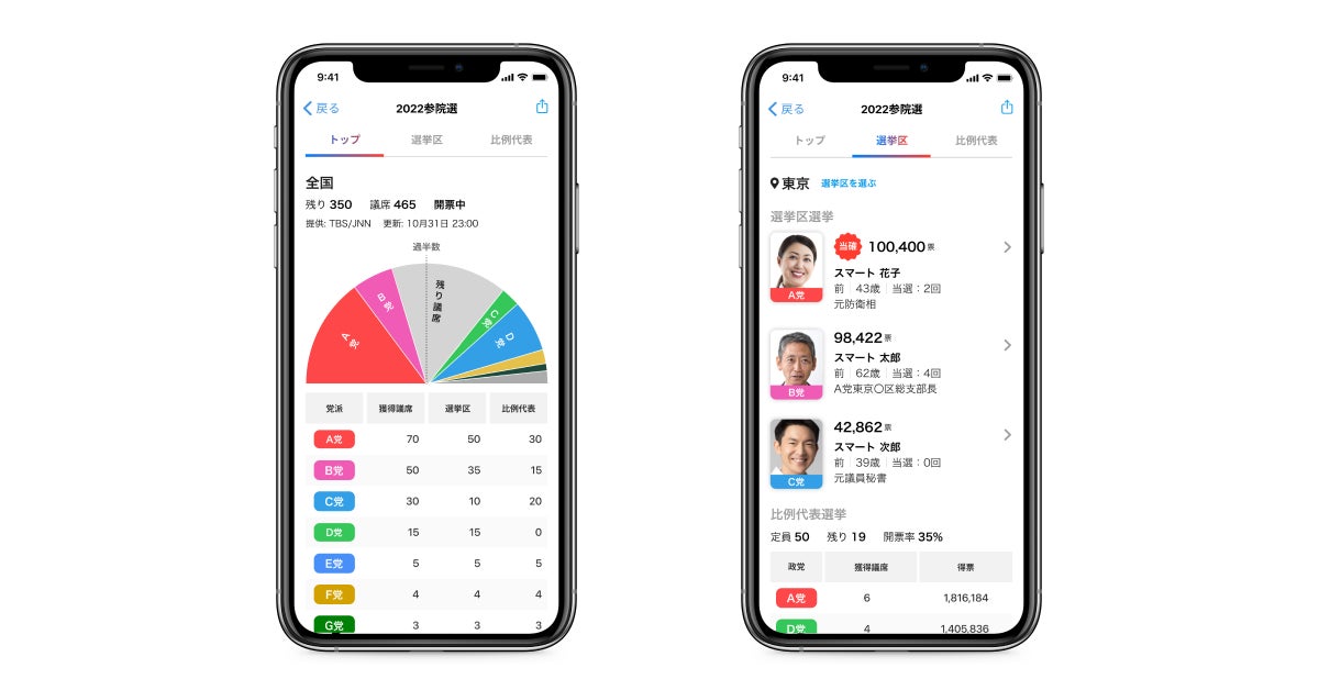 開票結果は、TBSテレビ/JNNが提供するデータをもとに随時更新され、ユーザーの方々はリアルタイムで各政党の獲得議席数や各選挙区の選挙結果を確認いただけます。