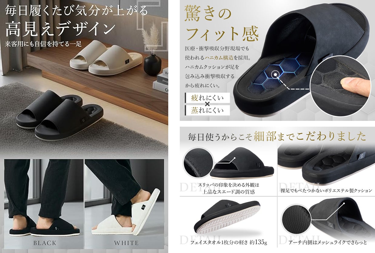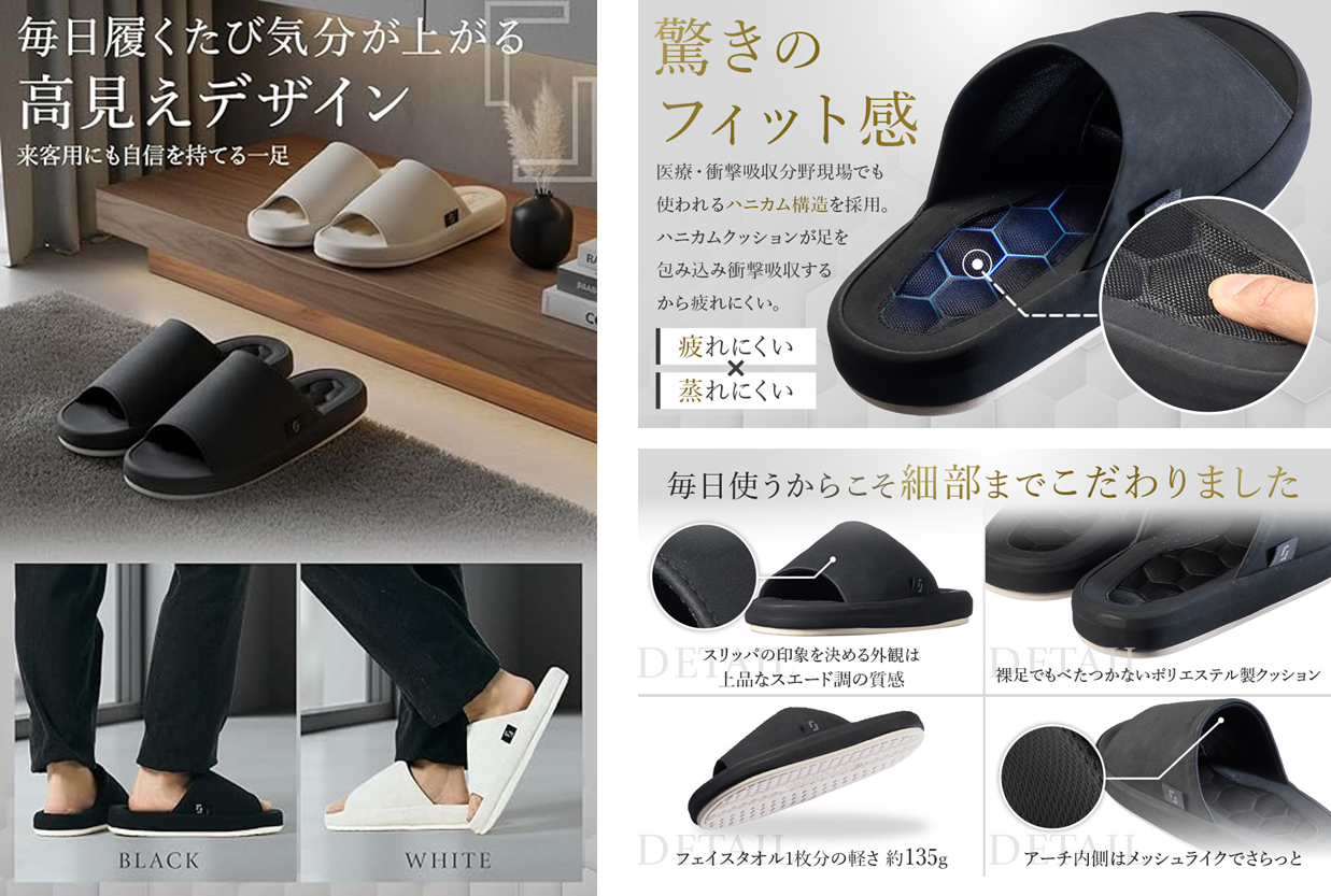 市場データや購買傾向、レビュー分析を通じて、スリッパ選びにおいて多くのユーザーが重視している「履き心地」「疲れにくさ」「デザイン性」という要素に着目しました。