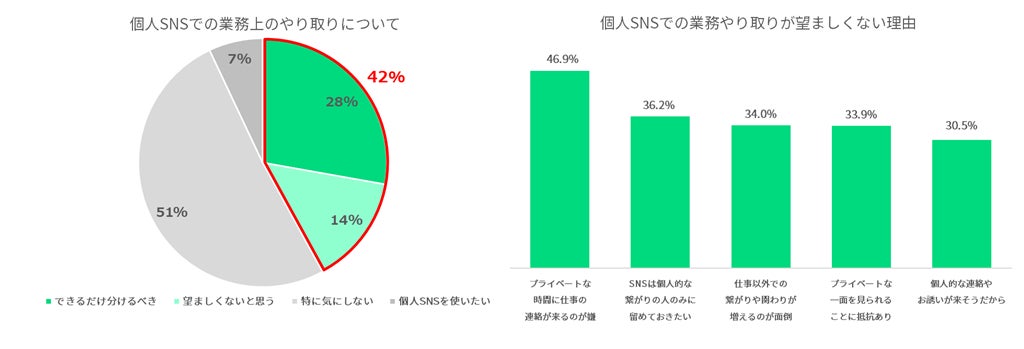 アルバイト従業員の42%が個人SNSでの業務上のコミュニケーションを問題視しており、その理由は「プライベートな時間に仕事の連絡が来ることを避けたい」「SNSは個人的なつながりにとどめておきたい」等が挙げられます。