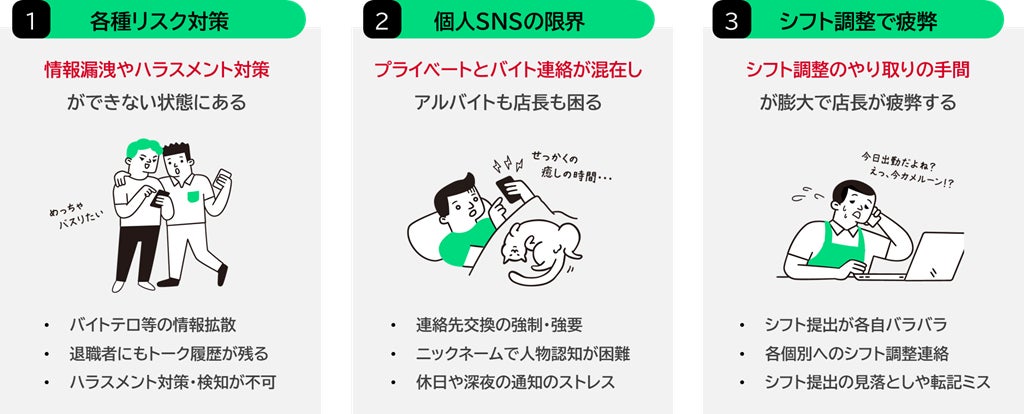 店舗管理者側の49%が個人SNSでの業務上のコミュニケーションを課題視しており、「情報漏えいやハラスメントなど各種リスクについて」「プライベートと業務の混在」「シフト調整のやりとりの手間」等が課題として挙げられます。