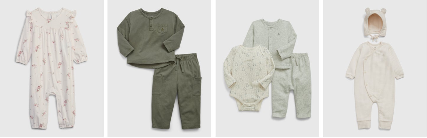 本コレクションは、50㎝~90㎝までの新生児やベビー向けのアイテムを揃え、生まれたばかりの赤ちゃんも安心して着られるオーガニックコットンなどの素材にこだわった、ボディスーツやアウトフィットセットなどのアイテムを展開します。デザインには、babyGapのオリジナルキャラクターとして長年愛されているBrannan Bear (ブラナンベア)が施されていたり、シーズンごとにカラーやデザインがリフレッシュされ、babyGapを代表とする人気コレクションです