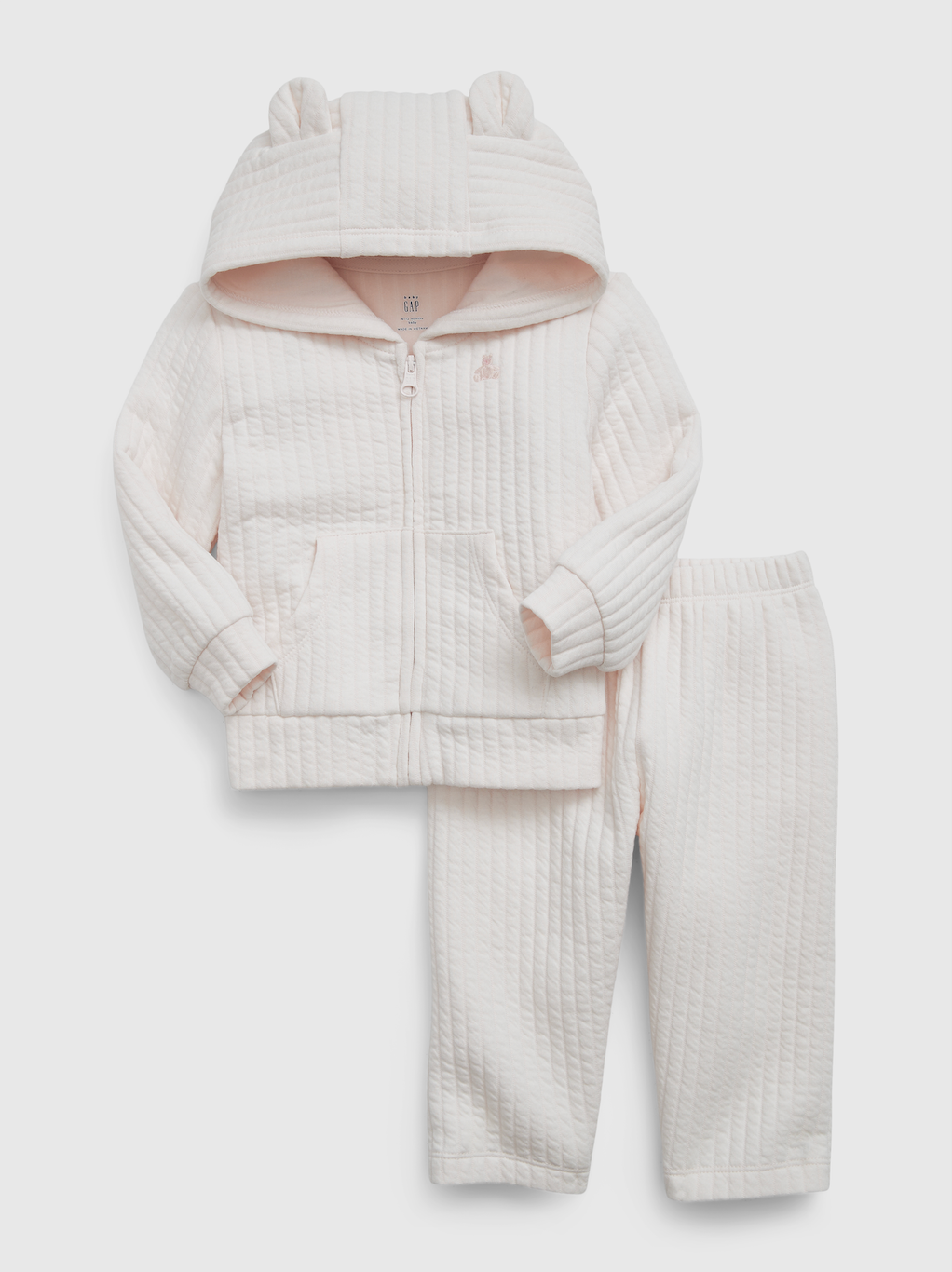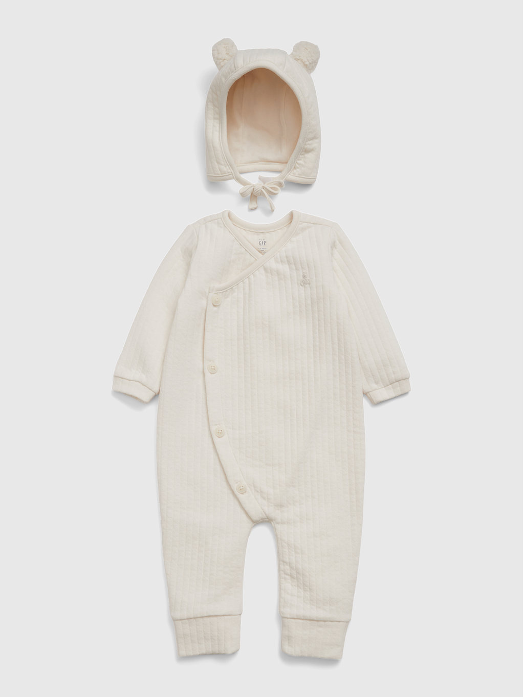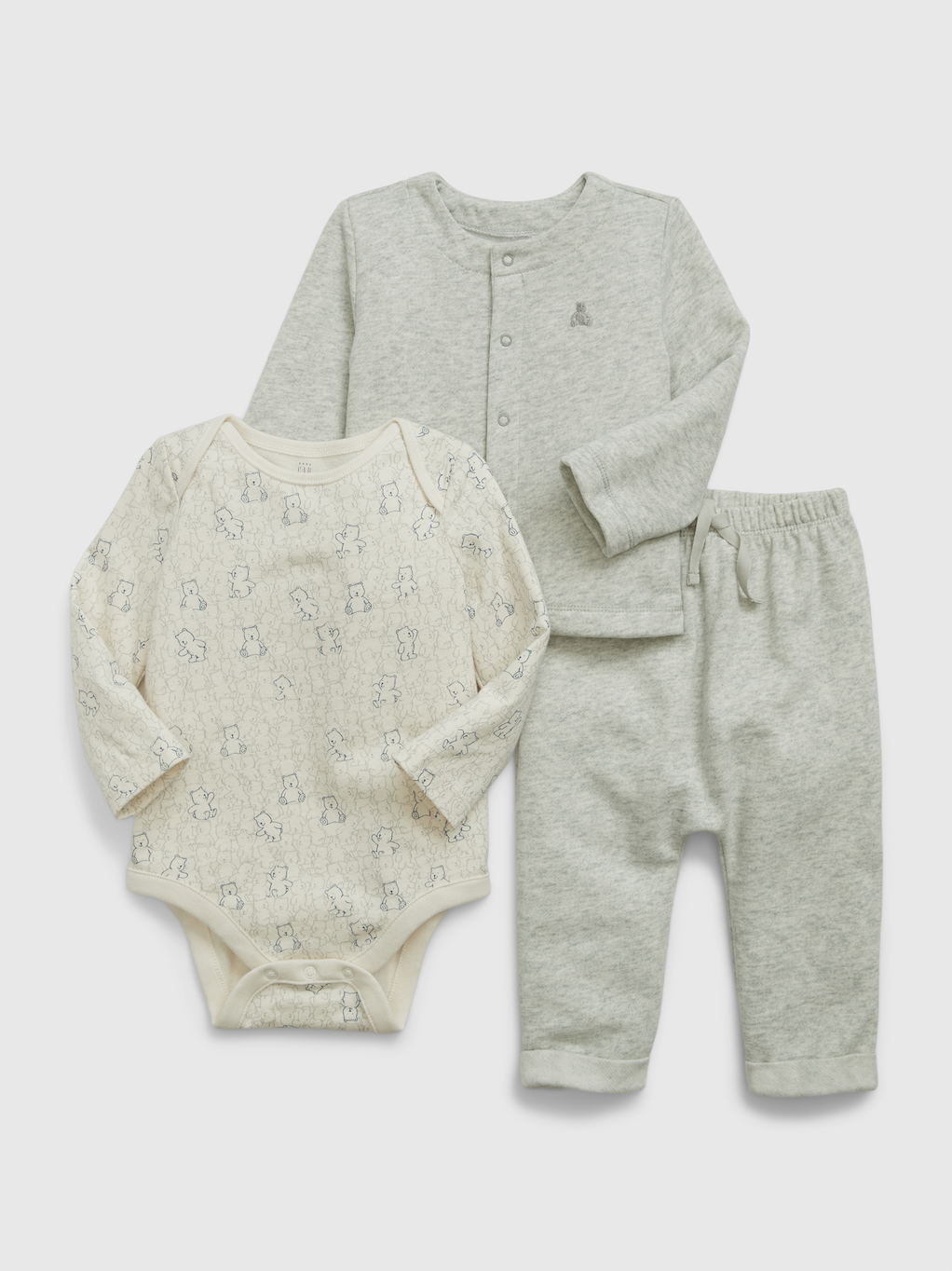 新生児向けには、首が座っていない赤ちゃんでも着脱しやすい前開きスナップボタンの長袖ボディスーツ、柔らかいスウェット素材のカーディガン&スウェットパンツの3点セット、前開きボタンの長袖ボディオールと耳付きハットの2点セットなど、ギフトにも最適なアイテムが並びます。