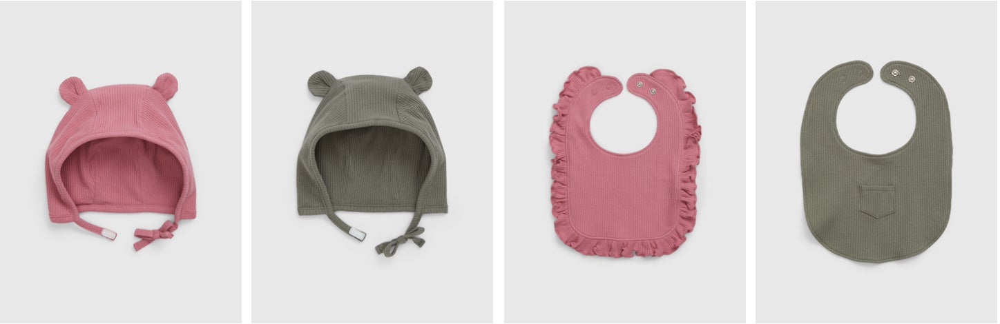 リブ素材のラインナップは、オールインワンや、ブラナンベアの耳がフードについたフーディー×パンツのセットアップ、ミニポケットやフリル付きのスタイ、ブラナンベアの耳を型どったボンネットハットなど、豊富なバリエーションで揃います。