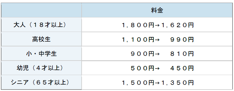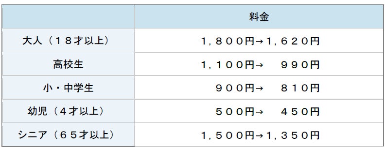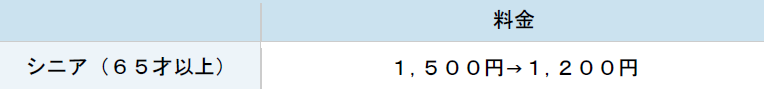 | 期 間:〜令和4年9月30日(金) 料 金:シニア(65才以上)1,500円→1,200円 販売場所:1階 チケット窓口 条 件:窓口にて年齢が確認できるもの (保険証・免許証・シニアカード等)のご提示をお願いします。 |