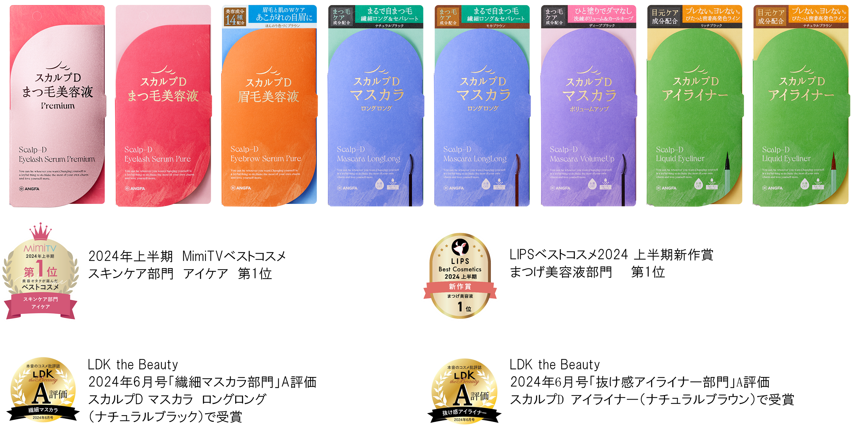 「スカルプDまつ毛美容液 プレミアム」は、「2024年上半期 MimiTVベストコスメ スキンケア部門 アイケア 第1位」、「LIPSベストコスメ2024 上半期新作賞 まつげ美容液部門 第1位」を受賞いたしました。また、シリーズ内の「スカルプD マスカラ ロングロング(ナチュラルブラック)」「スカルプD アイライナー(ナチュラルブラウン)」は、コスメを本音で評価する雑誌『LDK the Beauty』にて、A評価をW受賞いたしました。