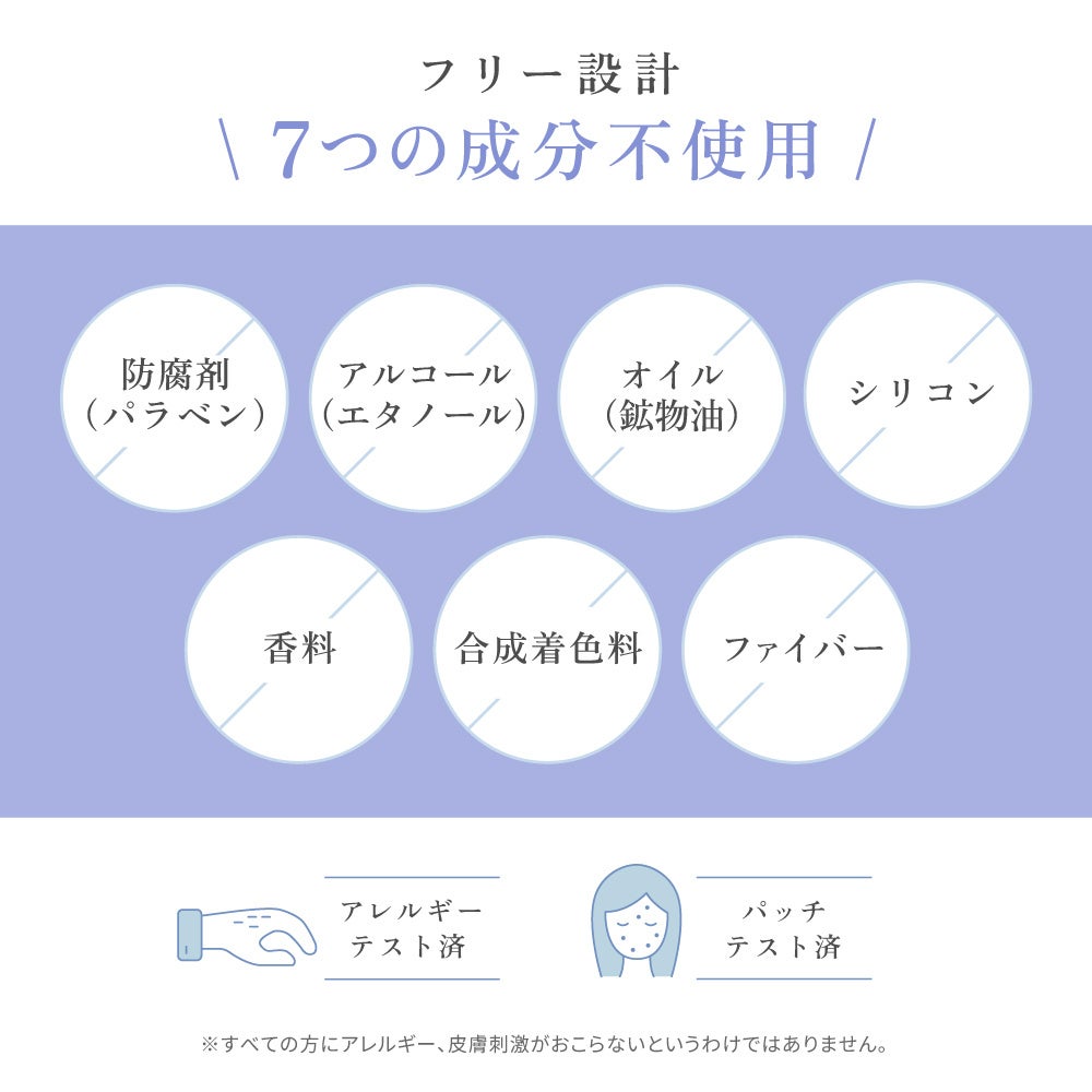 オイルやアルコールなど7つの成分を不使用としたフリー設計※3にこだわっています。また、アレルギーテスト・パッチテストの2つの肌テストを実施済みです。