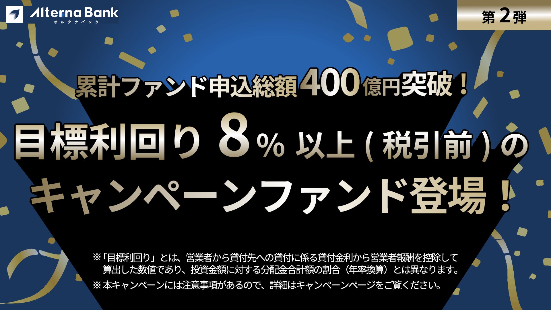 「オルタナバンク」累計ファンド申込総額400億円突破!(第2弾) 記念キャンペーン開催のお知らせ