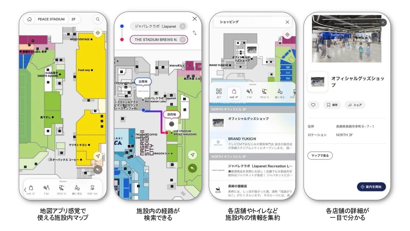 長崎スタジアムシティはサッカースタジアム、アリーナ、ホテル、ショッピングモール、オフィスなどの大型複合施設で、全5つのエリア情報をデジタルマップにし、施設内の経路検索が可能です。