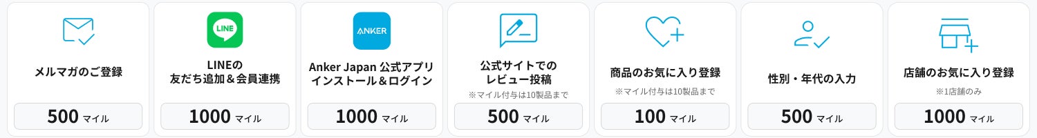 Anker Japan 公式オンラインストアや直営店Anker Storeで1円(税込)のお買い物につき1マイルの付与に加え、メールマガジンやLINE公式アカウントの登録、Anker Japan 公式アプリのインストールとログイン、Anker Japan 公式オンラインストアでのレビュー投稿等のアクションにより、マイルを貯めていくことができます。