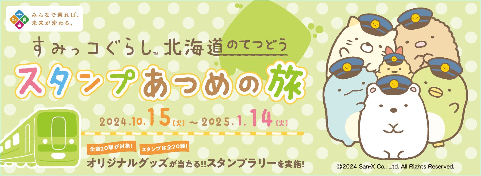 サンエックス株式会社(本社:東京都千代田区)は、北海道鉄道活性化協議会との初コラボレーション施策として、北海道内の鉄道利用促進を目的としたキャンペーン「すみっコぐらし 北海道のてつどうスタンプあつめの旅」が2024年10月15日(火)~2025年1月14日(火)の期間にて実施されることをお知らせします。