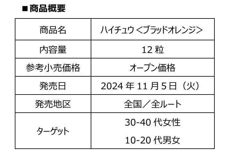 「ハイチュウ」は 1975 年の発売以来、心地よい食感とフルーツのジューシーな味わいで、長きにわたり多くのお客様にご愛顧いただいております。今回の「ハイチュウ<ブラッドオレンジ>」は、イタリア産果汁を使用したブラッドオレンジのコクのある濃厚な甘さとすっきりした酸味、そして芳醇な香りをお楽しみいただけます。濃厚でジューシーなフルーツの味わいを楽しめる商品の発売により、お客様に笑顔をお届けしてまいります。