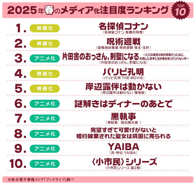 TOPPANホールディングス株式会社のグループ会社である、株式会社BookLive(本社:東京都港区・代表取締役社長:淡野 正)は、運営する総合電子書籍ストア「ブックライブ」において、【2025年春注目のおすすめメディア化作品】の特集ページを本日3月28日(金)より公開いたしました。ブックライブ会員から寄せられた<2025年春のメディア化作品注目度>アンケートの結果を、ユーザーコメントとともに発表いたします。