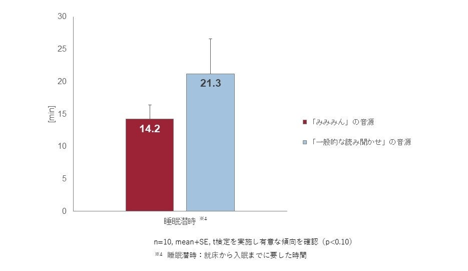 「おやすみ書店 みみみん」で配信するコンテンツは、声の5要素(強弱・抑揚・高低・間・音色)を定量的に分析し、こどもの睡眠を促す最適な朗読パターンによる睡眠誘導メソッドで音声を収録する「読み寝かせ」手法を採用しています。朗読には、日本テレビ元アナウンサーであり、絵本専門士として多くの読み聞かせ活動を行う杉上佐智枝氏を中心に、読み聞かせのスペシャリストが参画しています。開発段階において、「みみみん」の音源と「一般的な読み聞かせ」の音源を使用して、未就学児を対象とした睡眠への影響を検証したところ、読み聞かせ習慣のある子どもは、入眠時間が約7分短縮されることが、確認されました。
