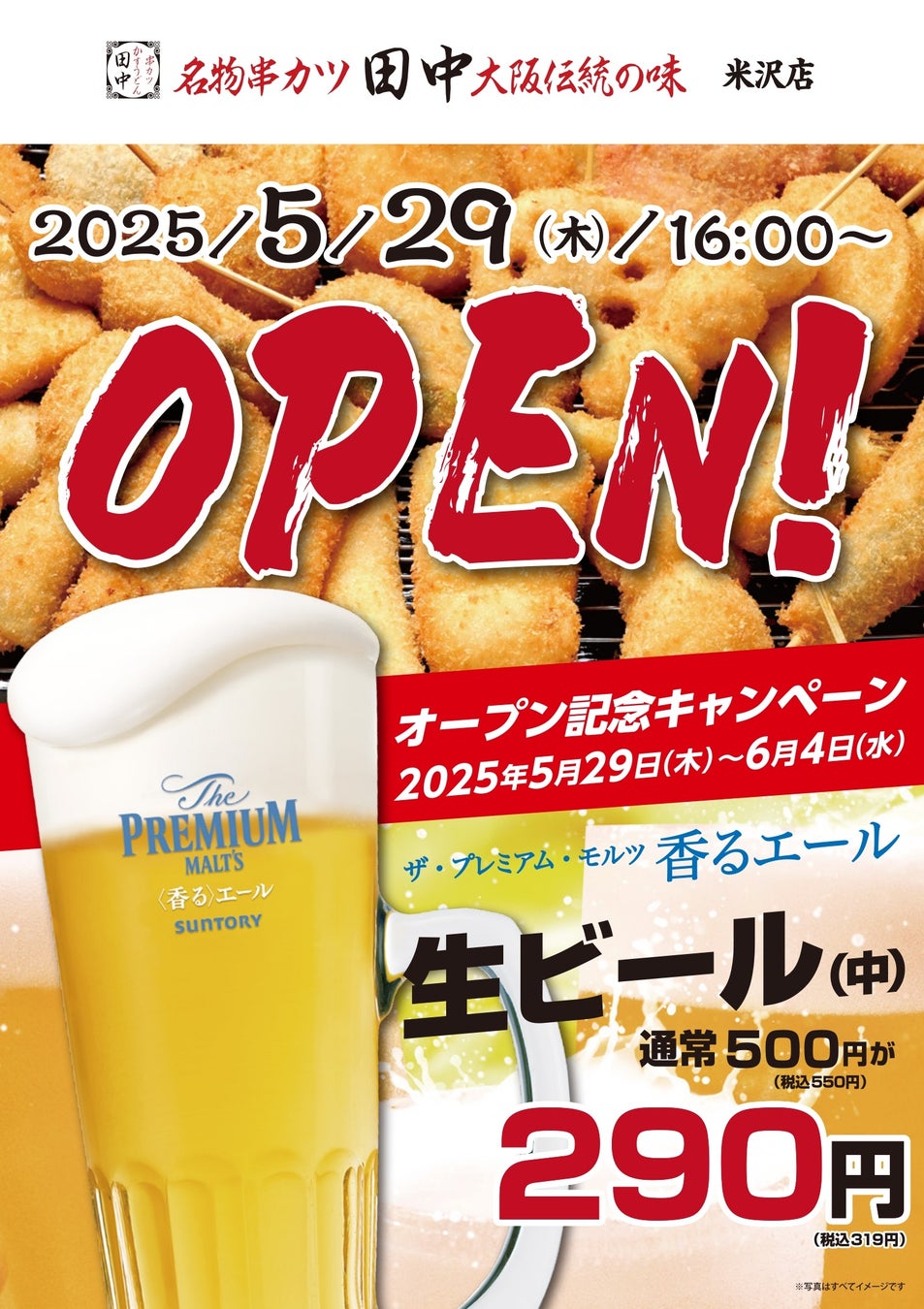 【新店情報】『串カツ田中 米沢店』が5月29日(木)にオープン!オープン記念キャンペーンで生ビール290円(税込319円)!