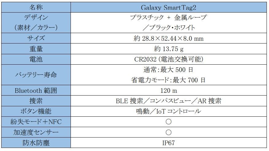 サムスン電子ジャパン株式会社は、韓国本社サムスン電子が10月5日に発売を発表した「Galaxy SmartTag2」を、この度初めて日本国内で発売することを決定いたしました。「Galaxy SmartTag2」はGalaxyスマートフォンやタブレットと接続し、鍵・財布・スーツケース・家族の荷物やペットなど、大切なものに取り付けておくだけで、SmartTag本体またはGalaxyスマートフォン・タブレットの捜索や音を鳴らして探せる便利なデバイスです。